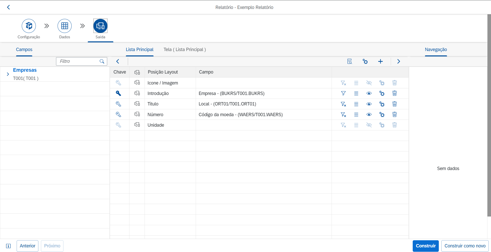 Nesta visualização, o relatório exibirá os campos selecionados da tabela T001, com a
