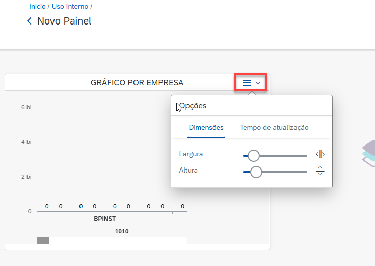 É possível alterar a altura e largura do gráfico clicando no menu de ações do mesmo, em seguida em “Opções”