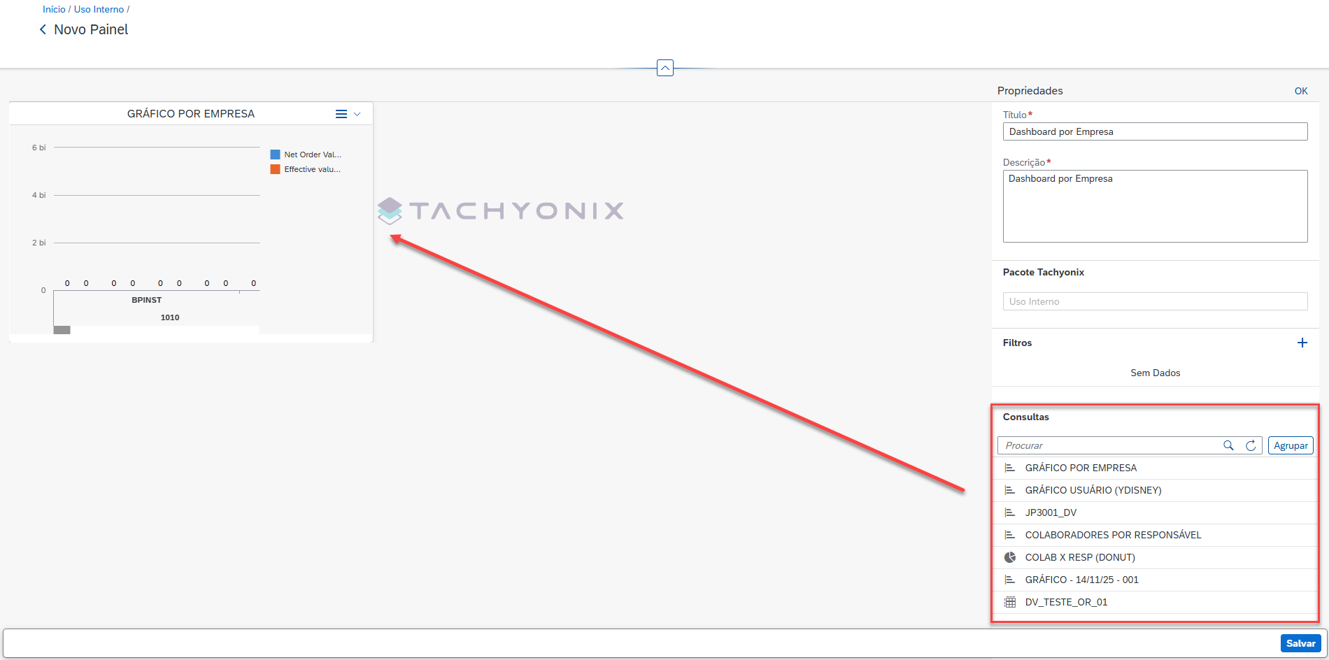 Informe o título e descrição para o dashboard. Arraste e solte as consultas desejadas que irão compor o dashboard