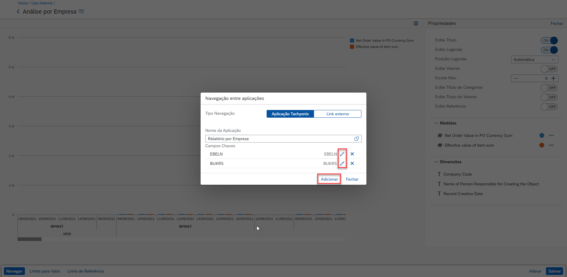 Clique nos ícones indicados nos campos para fazer a relação dos campos que serão informados para a aplicação no momento da navegação. Em seguida clique em “Adicionar”