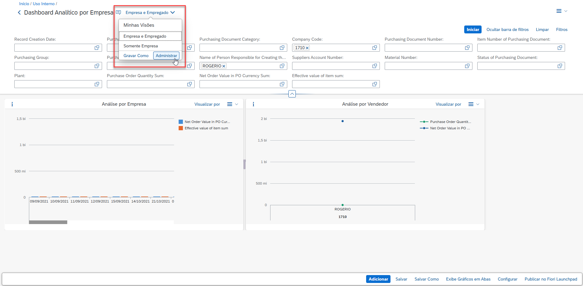 Preencha os filtros desejados, em seguida clique em “Padrão” e depois em “Gravar Como”. Informe um nome para variante. Caso deseje que os filtros informados sejam aplicados sempre que abrir o dashboard, então marque a opção “Determinar como padrão”.