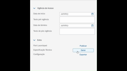 No canto direito da tela, dentro da seção Extra, localiza-se o botão Gerar referente à Especificação Técnica. Este botão é responsável por criar automaticamente o documento técnico da aplicação.