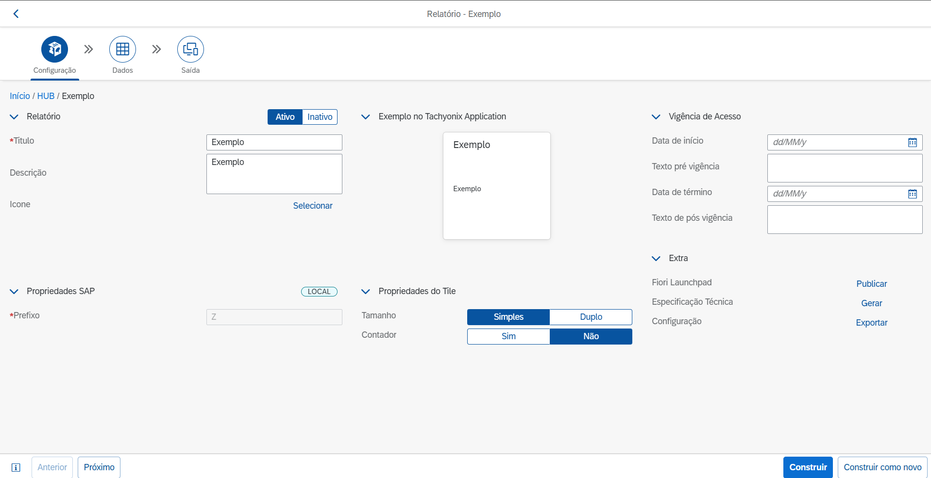Após concluir o processo de construção de uma aplicação no Tachyonix Builder, acesse a aba Configuração. Nesta tela, é possível visualizar e editar as propriedades gerais da aplicação, como nome, descrição, status (Ativo/Inativo), ícone, vigência de acesso e propriedades SAP.