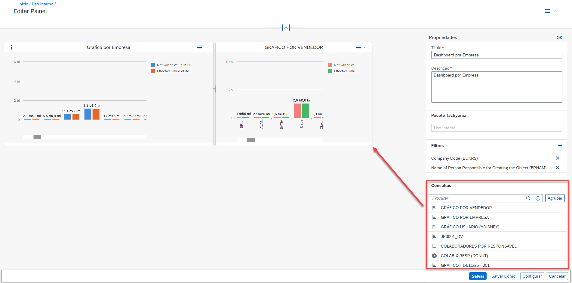 Arraste e solte as consultas desejadas que irão compor o dashboard