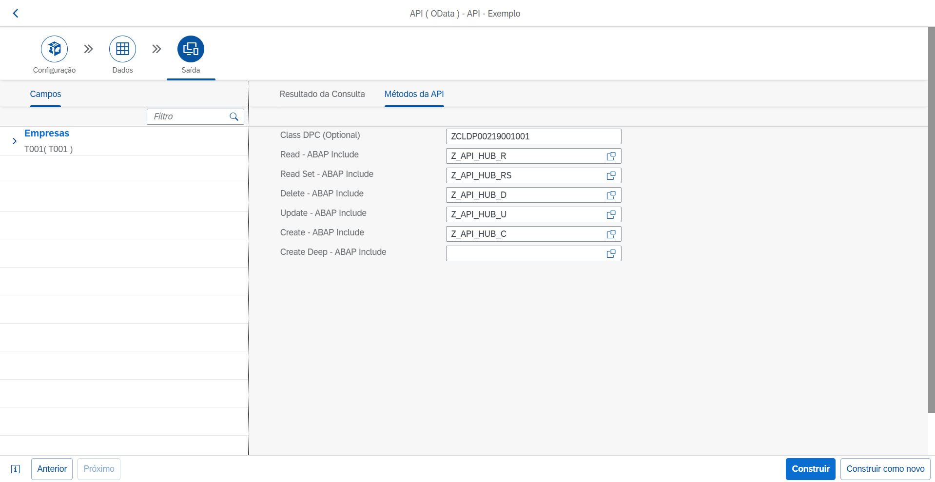 Dica: mantenha a consistência de nomenclatura conforme o padrão do projeto (ex: ZMM_P003). Após salvar, o Builder gerará automaticamente a classe principal da API com os includes referenciados.