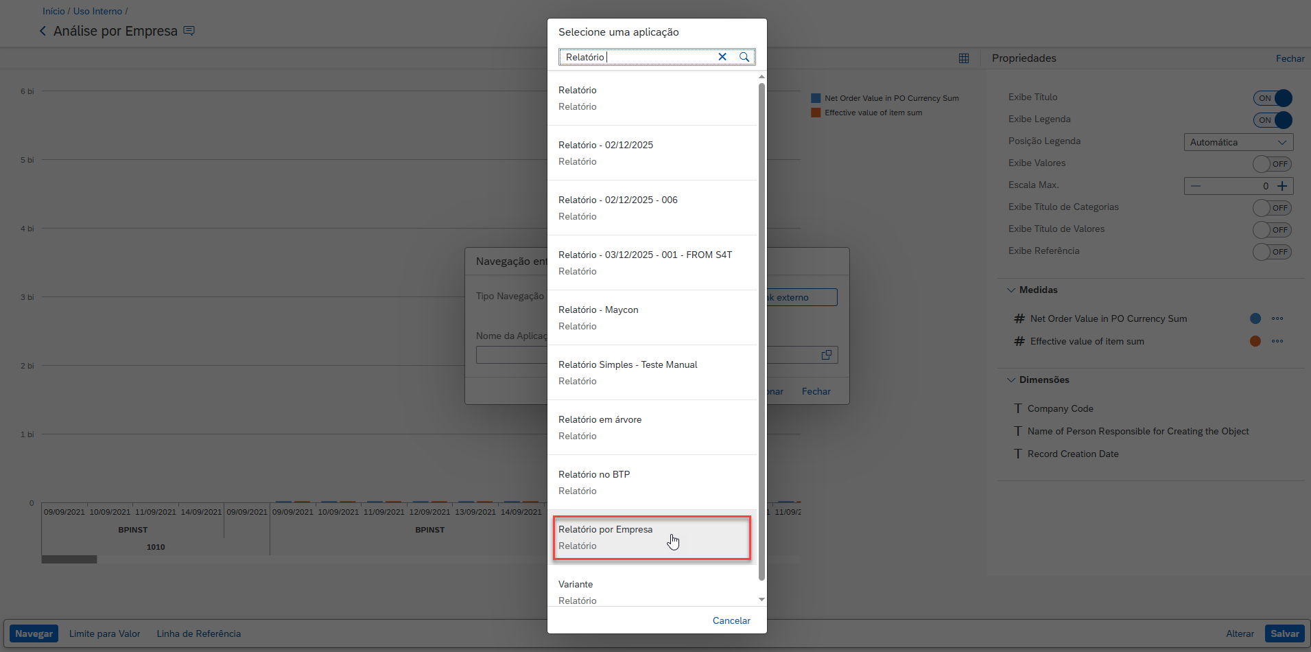 Na aba “Todas” são exibidas, além das favoritas, outros dashboards analíticos, dashboards transacionais ou storyboards que tenham campos em comum com o gráfico selecionado. Para esses casos não é necessário configurar a navegação. A ferramenta disponibiliza essas opções para navegação automaticamente.