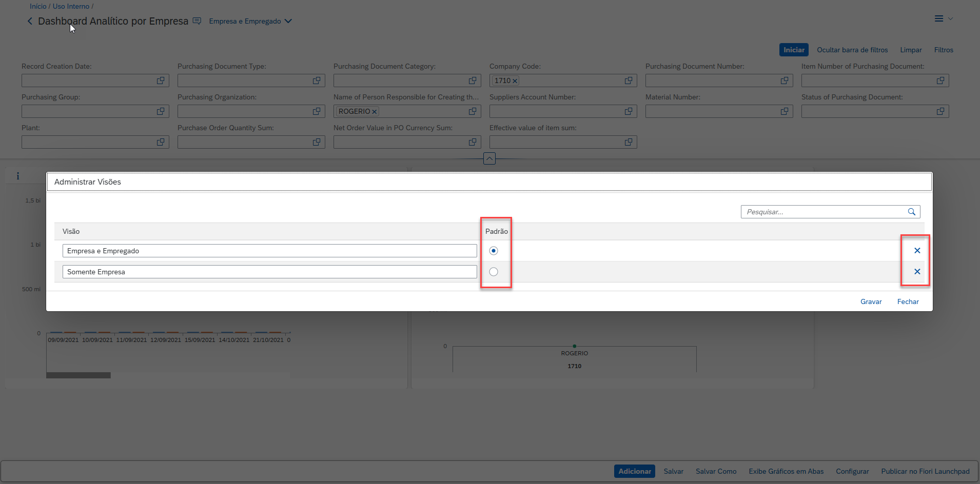 Preencha os filtros desejados, em seguida clique em “Padrão” e depois em “Gravar Como”. Informe um nome para variante. Caso deseje que os filtros informados sejam aplicados sempre que abrir o dashboard, então marque a opção “Determinar como padrão”.